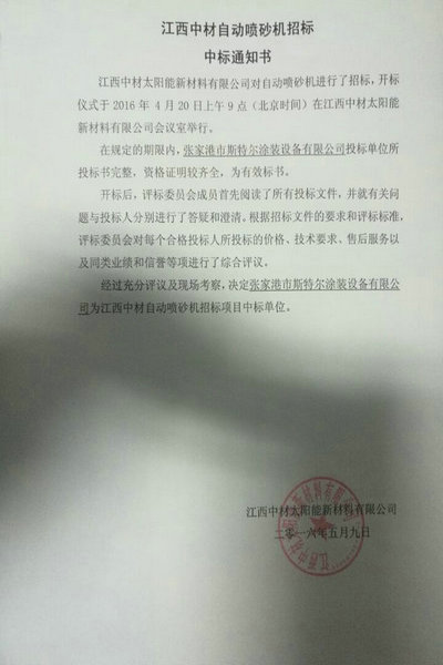 我公司成功中標數控石英坩堝噴砂機,斯特爾設計制造的數控石英坩堝自動噴砂機得到了江西中材太陽能新材料四虎影视免费永久大全-四虎8848精品成人免费网站-四虎视频国产精品免费入口-四虎4hu永久免费网站影院高度好評,經過多次的技術溝通,中材技術領導人員對斯特爾公司現場考察,最終成功中標,也為我公司在太陽能行業打下基礎,目前我公司生產的太陽能石英坩堝數控噴砂機在能耗上實現節能,設備無需基礎,大大降低了設備投入費用,斯特爾公司致力于打造,穩定、節能、高效的石英坩堝數控自動噴砂機為目的。