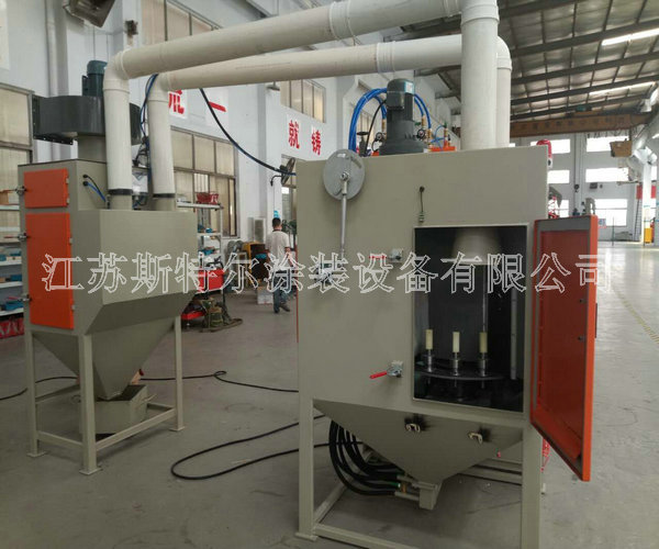 斯特爾機械為泰州客戶設計非標的圓盤自動式噴砂機交付使用! 自動式行星轉盤式自動噴砂機是泰州創新電子總公司為旗下第七個子公司:中山市臺海電子四虎影视免费永久大全-四虎8848精品成人免费网站-四虎视频国产精品免费入口-四虎4hu永久免费网站影院定制的一款自動噴砂機,該設備不僅為客戶節約了人力物力,更為客戶的產品提升了一個檔次。行星轉盤式自動噴砂機配置6把高效噴砂槍,每把槍單獨控制,除塵風機、工件旋轉電機、轉盤旋轉電機、噴槍擺動電機以及室體照明總功率約為4.55KW,大轉盤上共14個工位,可連續不間斷工作,加工和更換工件同步進行,工件處理效率約6-12秒/件,根據工件大小不同確定時間。我公司在設計噴砂機方面采用噴槍數量少,加工效率高的原則進行噴砂機的整機設計制作,充分利用斯特爾噴砂機的多方面優勢采用機械運動件、及機械部份的高穩定性的自動化流程實現噴砂處理加工效率高、整體在使用中降低能耗等優點。