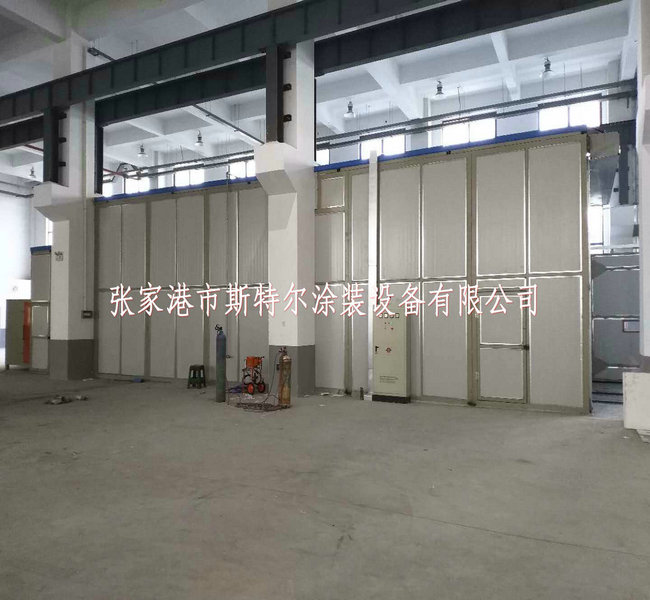 三套涂裝房包括噴砂房,噴漆房,噴鋅房并排置于車間內北側,三套大門平齊朝南,北側與車間之間留有2米距離,用于制作過濾箱和檢修通道。三套房體之間公用兩扇墻體。